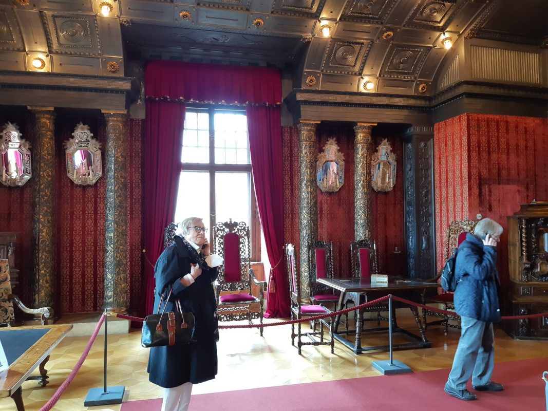 Wir gingen durch etwa 20 Räume und sahen Badezimmer, Ankleidezimmer, Empfangsräume, Schlafzimmer, Esszimmer, eine Bibliothek, einen großen Ballsaal, die Küche und modernere Räume, die bis Anfang des 20. Jahrhunderts bewohnt waren.  Den Schluss bildete eine große Waffenhalle, für deren Details wir dann aber leider nur noch wenig Zeit hatten.