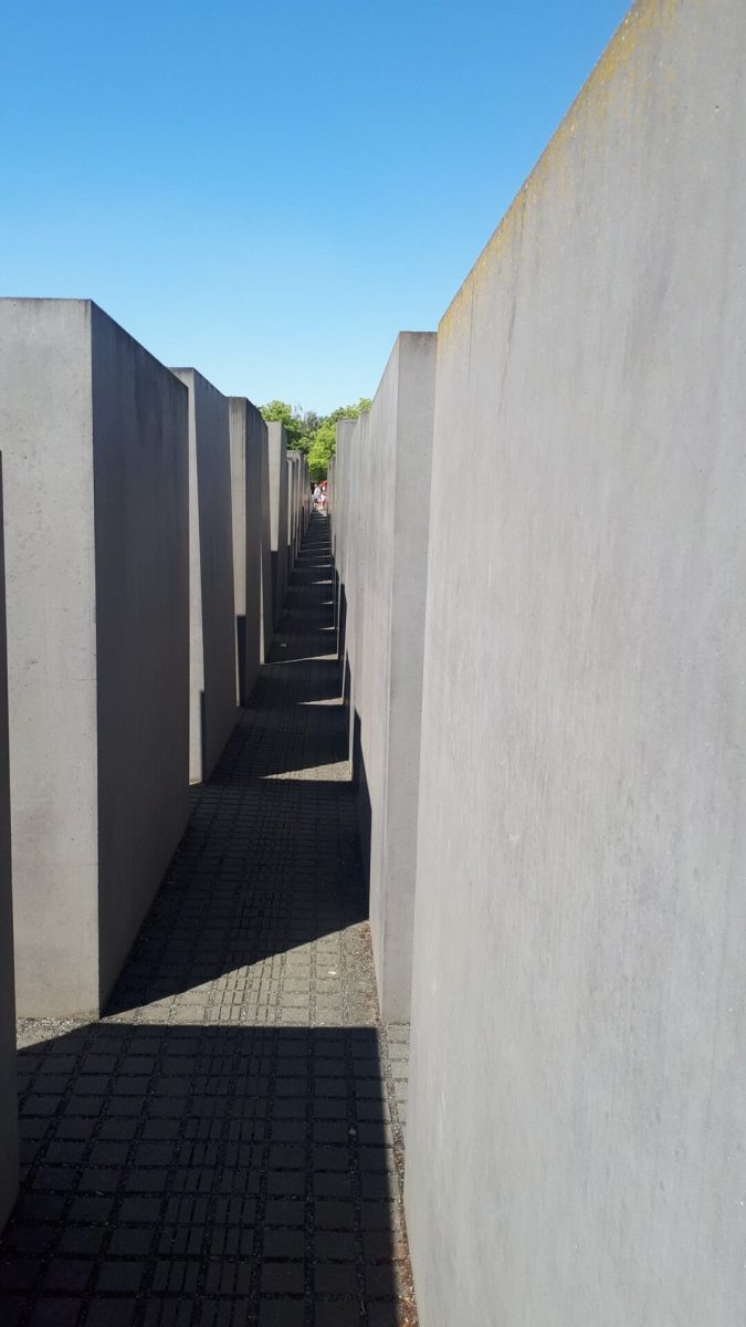 Zunächst fangen die Stelen niedrig an – durch Senkung des Geländes werden die Betonstelen immer höher. Man fühlt sich ungewollt hilflos, und auch der Blick ans Ende der Betonreihen hilft da nicht weiter. Die Dramaturgie der Betonskulptur erfüllt ihren gewollten Zweck. Erleichtert strebt man bei ansteigendem Gelände und niedriger werdenden Betonstelen dem Ausgang zu.